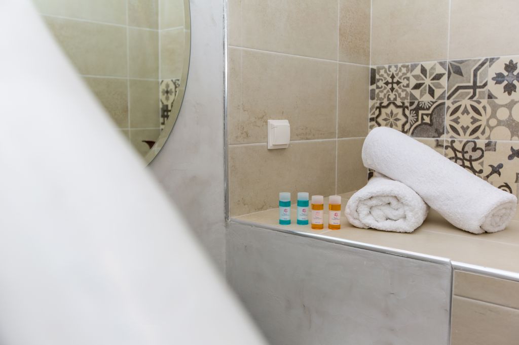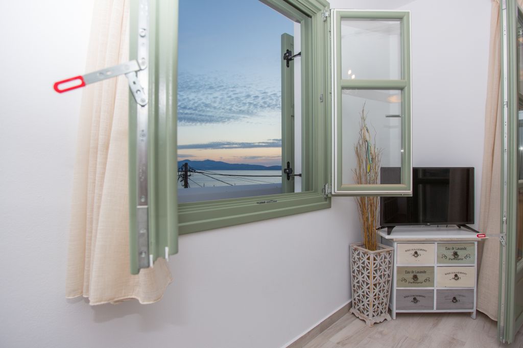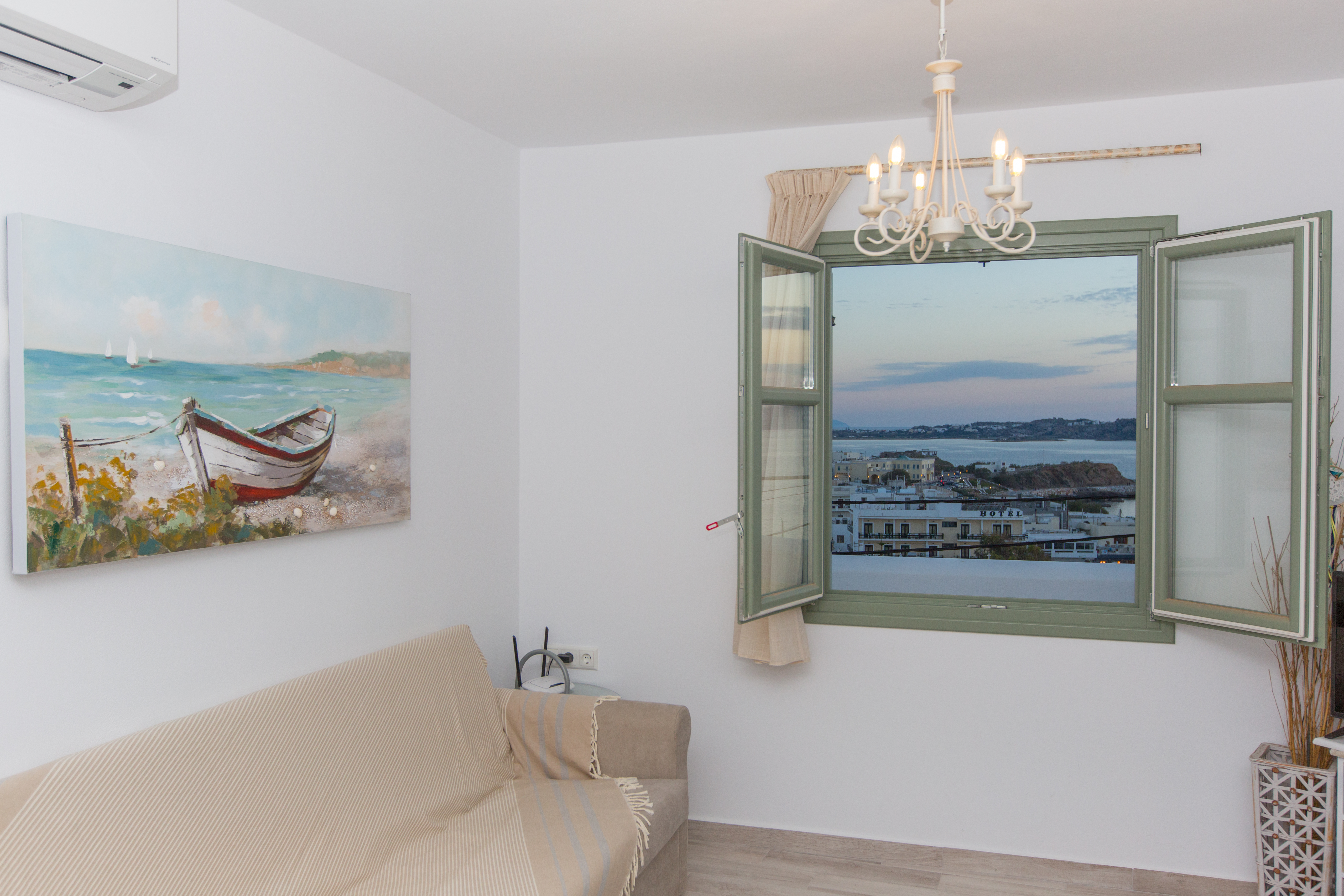 The Suite, 40 square meter, can accommodate up to 2 guests and 2 children or 3 adults and includes a fully equipped kitchen, a spacious dining area, a comfortable lounge with couch that can be also used as beds, one double bedroom and the main bathroom. The Suite has a Huge Veranda with spectacular view on Paros, The Port of Naxos and the yacht marina.