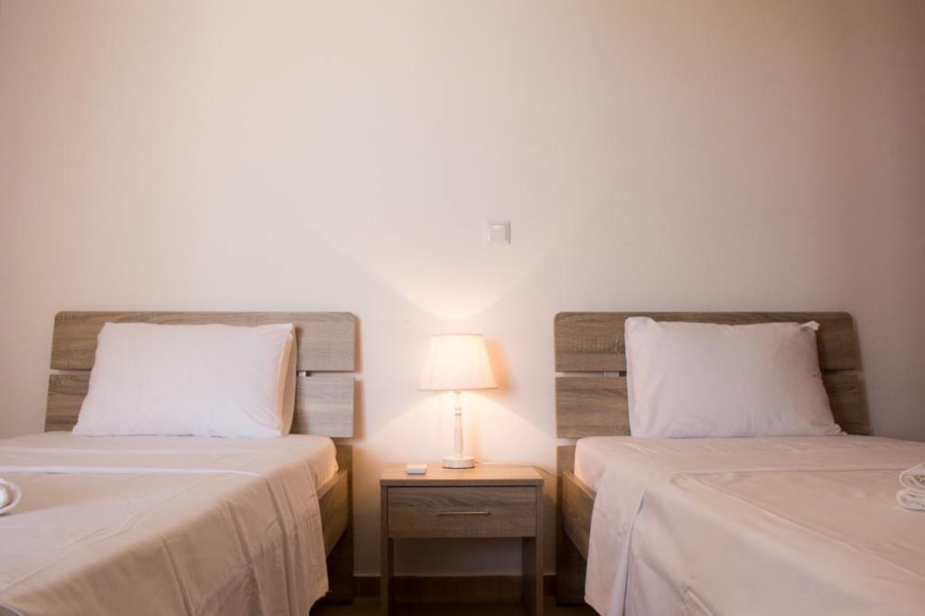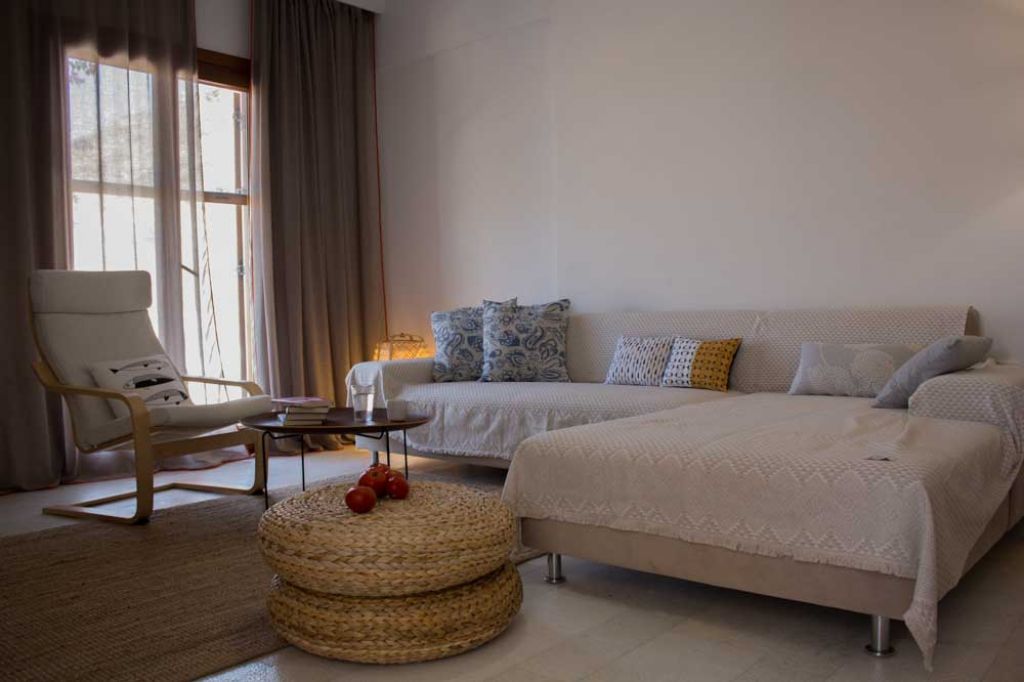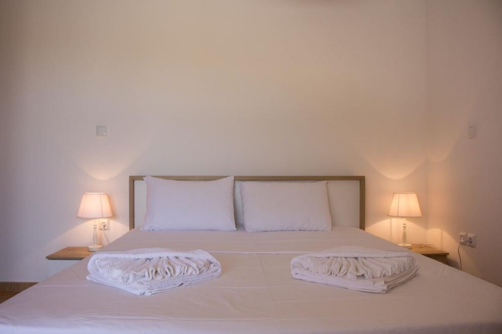The guesthouses (Fokiano, Potamissi, Mandylaria, Rozako, Savvatiano, Roditis) names that represent an old local grape variety) are 85 m2 or 110 m2, surrounded by a big terrace of 60 sq.m. each. The interior consists of a living room with dining area and a fully equipped kitchen, two or three bedrooms, all with access to the terrace from large balcony doors, bathrooms and WC . The flower beds that surround the premises are planted with various seasonal vegetables, to which visitors have free access.